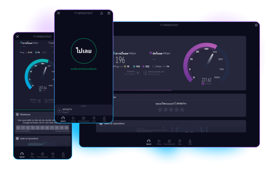 พบกับความเร็วการเชื่อมต่อมือถือของคุณด้วยการทดสอบที่ง่ายดายเพียงการแตะครั้งเดียว แม่นยำไม่ว่าจะทดสอบที่ใดก็ตาม ด้วยเครือข่ายเซิร์ฟเวอร์ของเราที่มีอยู่ทั่วโลก แอป Speedtest ฟรีของเรามีให้ใช้ทั้งบน Android และ iOS.